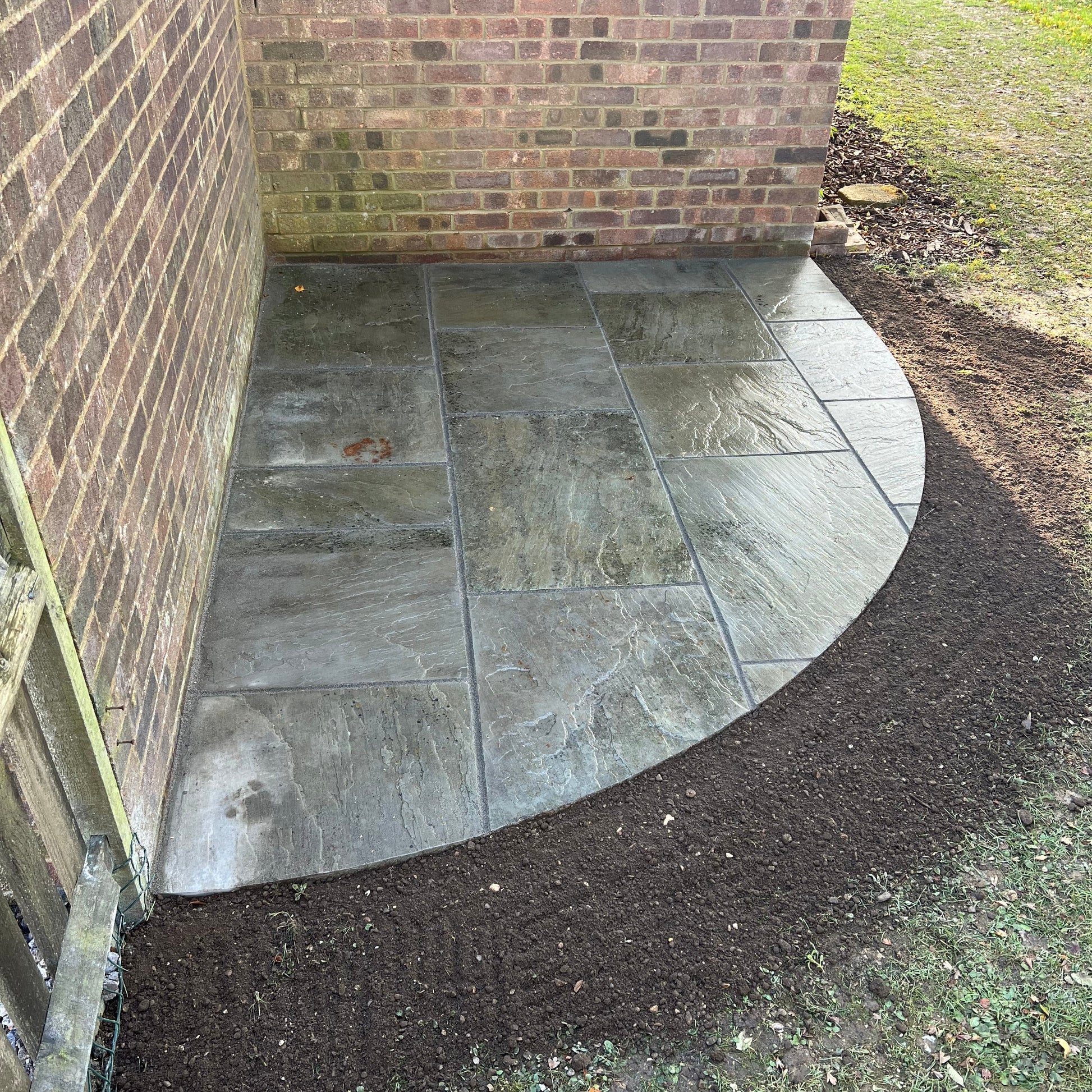 Completed in summer 2025, this project involved creating a small, curved Indian sandstone patio at a property in Stoke Row. Designed to follow the natural lines of the house, the curved layout allowed the patio to sit comfortably within a compact corner of the garden. At the client’s request, repurposed sandstone slabs were used, offering a more cost-effective solution while still achieving an attractive and practical finish.