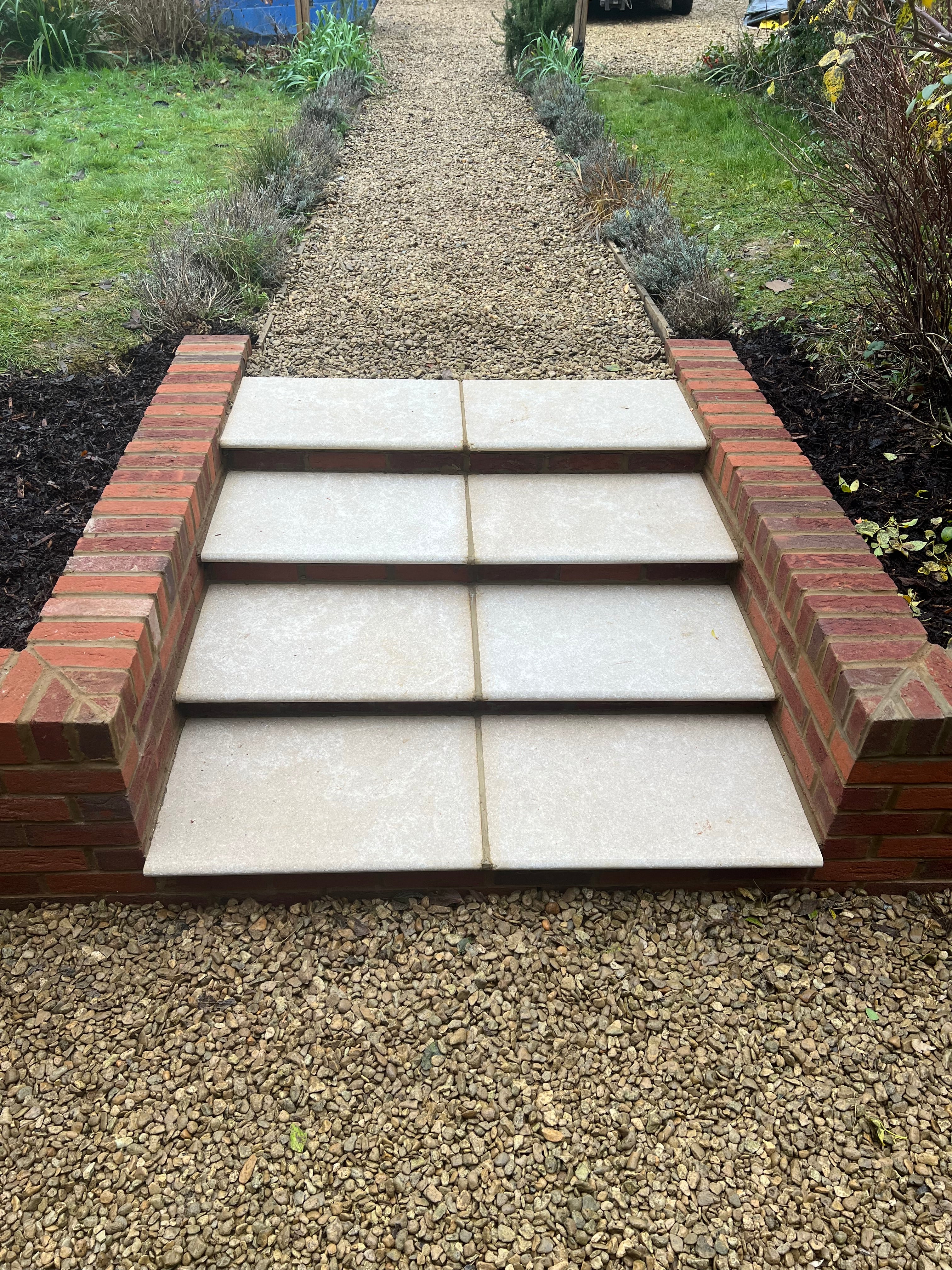 This project was completed at a property in Stoke Row and involved the construction of a red brick retaining wall with Oxford stone steps to enhance the front of the house. The design was carefully considered to match the existing brickwork, ensuring a cohesive and traditional appearance. While rooted in classic brickwork, the inclusion of sleek, low-profile yet deep steps introduced a subtle modern element, delivering both visual appeal and everyday functionality.